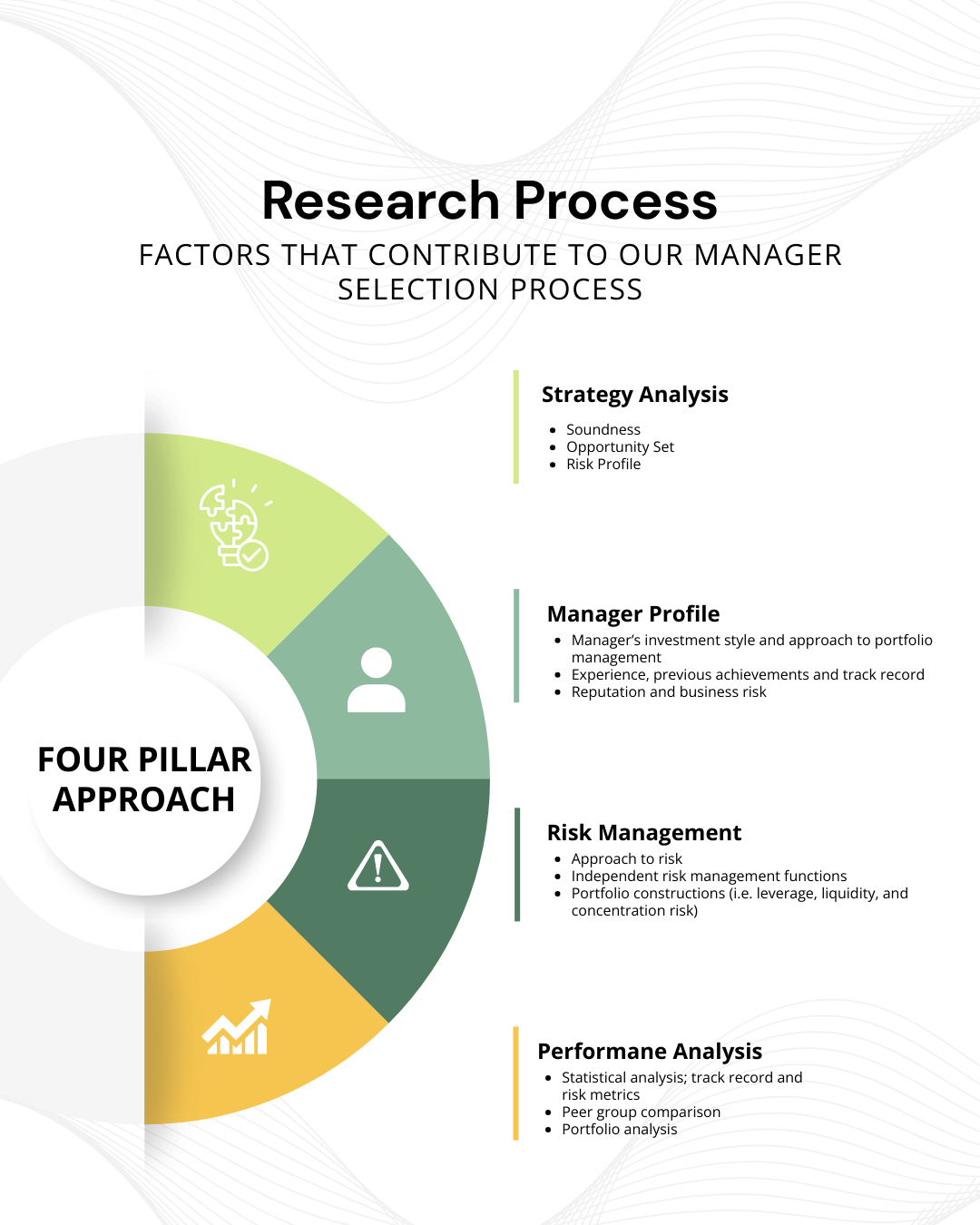 Once a prospective manager enters our pipeline, the due-diligence process begins, a disciplined, long-term observational cycle that incorporates both quantitative and qualitative factors to determine true investability and fit for the portfolio.
